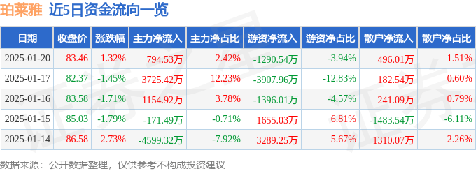 股票行情快报:珀莱雅(603605)1月20日主力资金净买入794.53万元