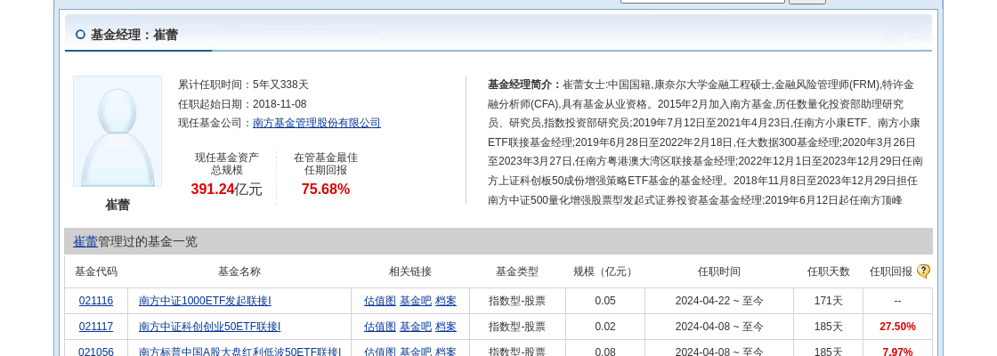 简历显示,崔蕾女士:中国国籍,康奈尔大学金融工程硕士,金融风险管理师(FRM),特许金融分析师(CFA),具有基金从业资格。2015年2月加入南方基金,历任数量化投资部助理研究员、研究员,指数投资部研究员;2019年7月12日至2021年4月23日,任南方小康ETF、南方小康ETF联接基金经理;2019年6月28日至2022年2月18日,任大数据300基金经理;2020年3月26日至2023年3月27日,任南方粤港澳大湾区联接基金经理;2022年12月1日至2023年12月29日任南方上证科创板50成份增强策略ETF基金的基金经理。2018年11月8日至2023年12月29日担任南方中证500量化增强股票型发起式证券投资基金基金经理;2019年6月12日起任南方顶峰TOPIXETF(QDII)基金经理;2019年7月12日起任有色金属、南方有色金属联接、1000ETF基金经理;2019年11月29日至2023年7月4日任南方粤港澳大湾区ETF基金经理;2020年1月17日起任红利50基金经理;2020年1月21日起任南方大盘红利50基金经理;2020年1月17日起任红利50基金经理;2020年1月21日起任南方大盘红利50基金经理;2021年8月19日起任南方中证科创创业50ETF联接基金经理;2021年9月27日起任南方中证1000联接基金经理。2021年12月29日起任南方国证在线消费ETF基金经理;2022年1月26日起任南方中证500增强策略ETF基金经理。2021年6月24日起任南方中证科创创业50ETF基金经理;2022年1月26日起任南方中证500增强策略ETF基金经理;2022年11月23日起任南方国证交通运输行业ETF基金经理。2023年11月24日至今,任南方国证交通运输行业ETF发起联接基金经理。
